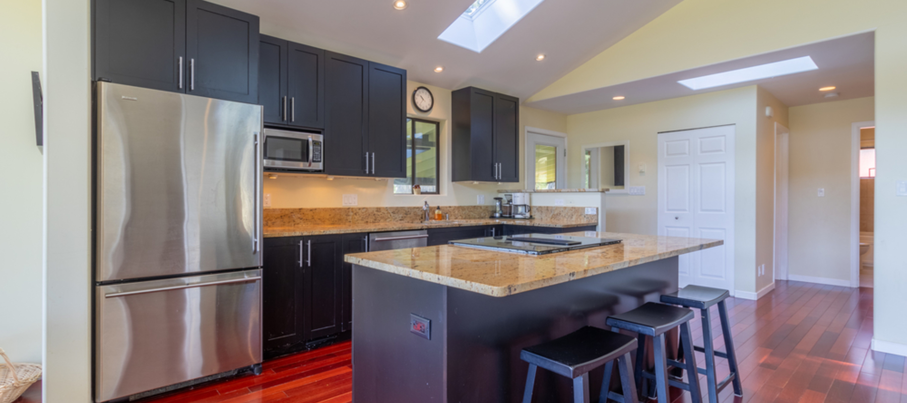 Featuring a chef-inspired kitchen, custom cabinetry, granite countertops, SS appliances, rich hardwood flooring, recessed lighting & French Doors that invite the outdoors in.